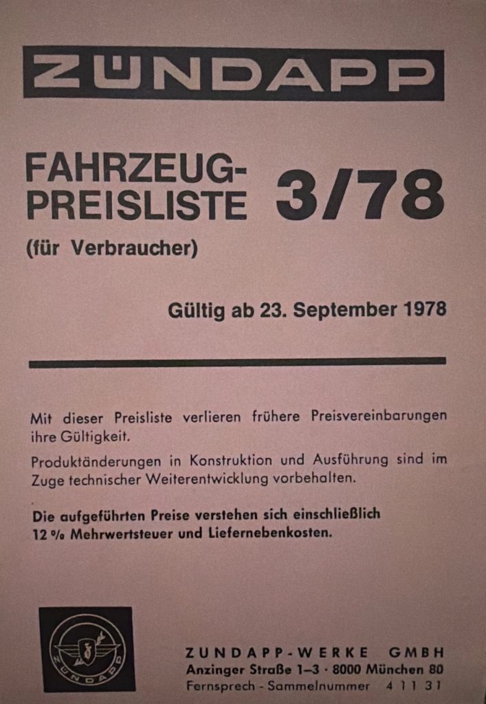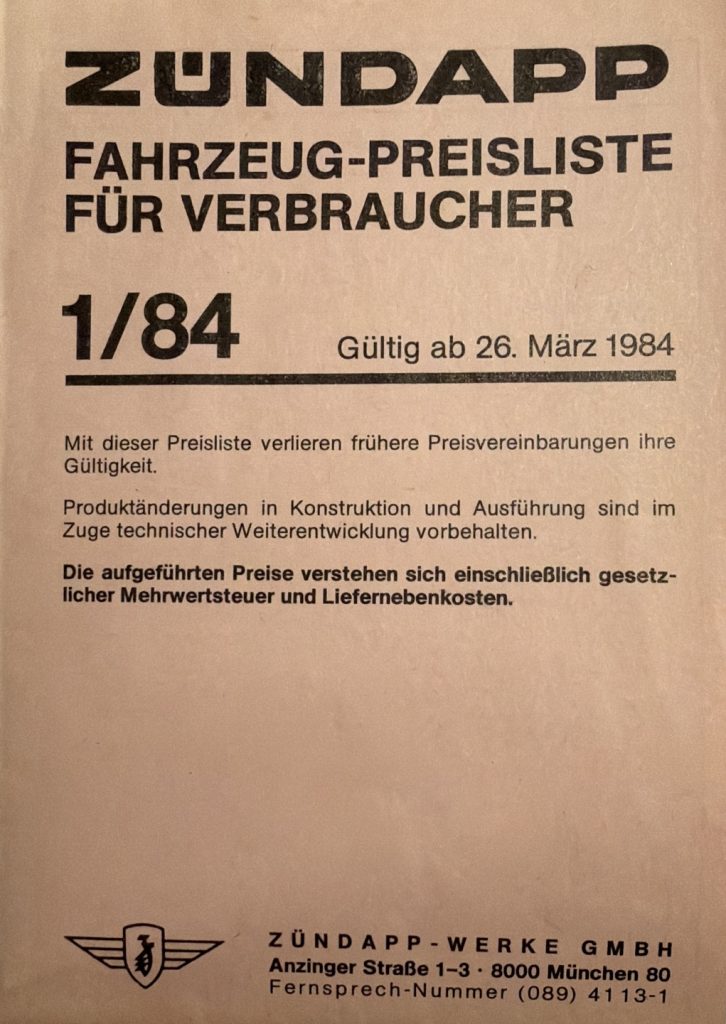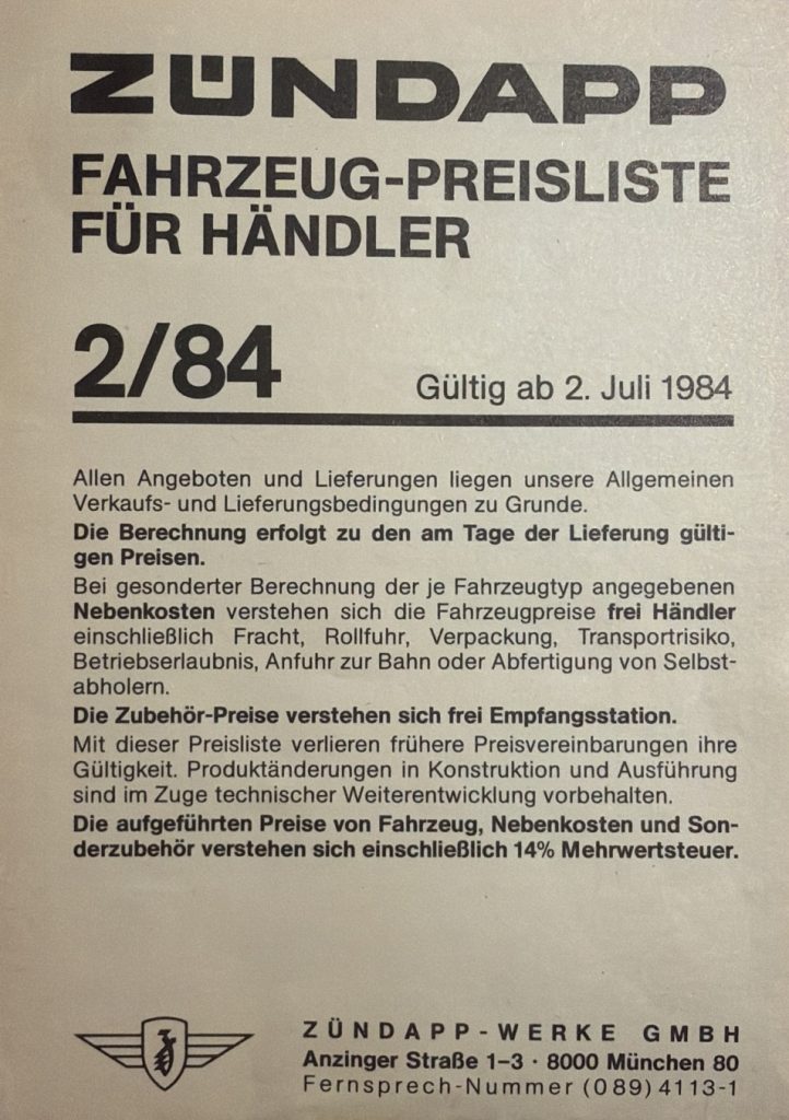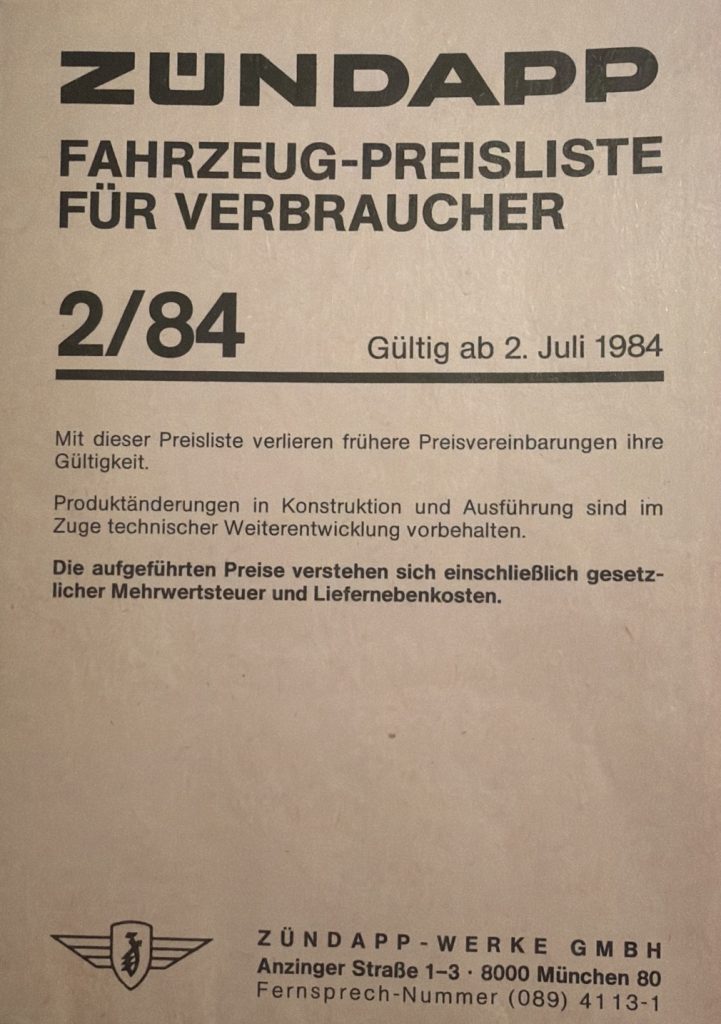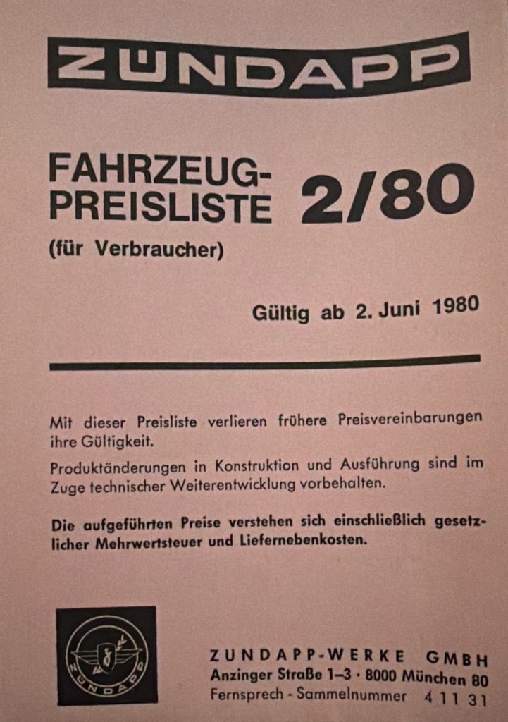 ZÜNDAPP – Preislisten Hier sind ein paar Original Preislisten aus meiner Sammlung. 1976 PREISLISTE 1/76 – HIER KLICKEN 1977 PREISLISTE 1/77 – HIER KLICKEN 1978 PREISLISTE 3/78 – HIER KLICKEN 1980 REISLISTE 2/80 – HIER KLICKEN PREISLISTE 3/80 – HIER KLICKEN 1981 PREISLISTE 1/81 – HIER KLICKEN PREISLISTE 3/81 – HIER KLICKEN 1982 PREISLISTE 1/82 – HIER KLICKEN PREISLISTE 2/82 – HIER KLICKEN 1984 PREISLISTE 1/84 – HIER KLICKEN PREISLISTE 2/84 – HIER KLICKEN FAHRZEUG-PREISLISTE FÜR HÄNDLER 1984 HÄNDLER PREISLISTE 2/84 – HIER KLICKEN