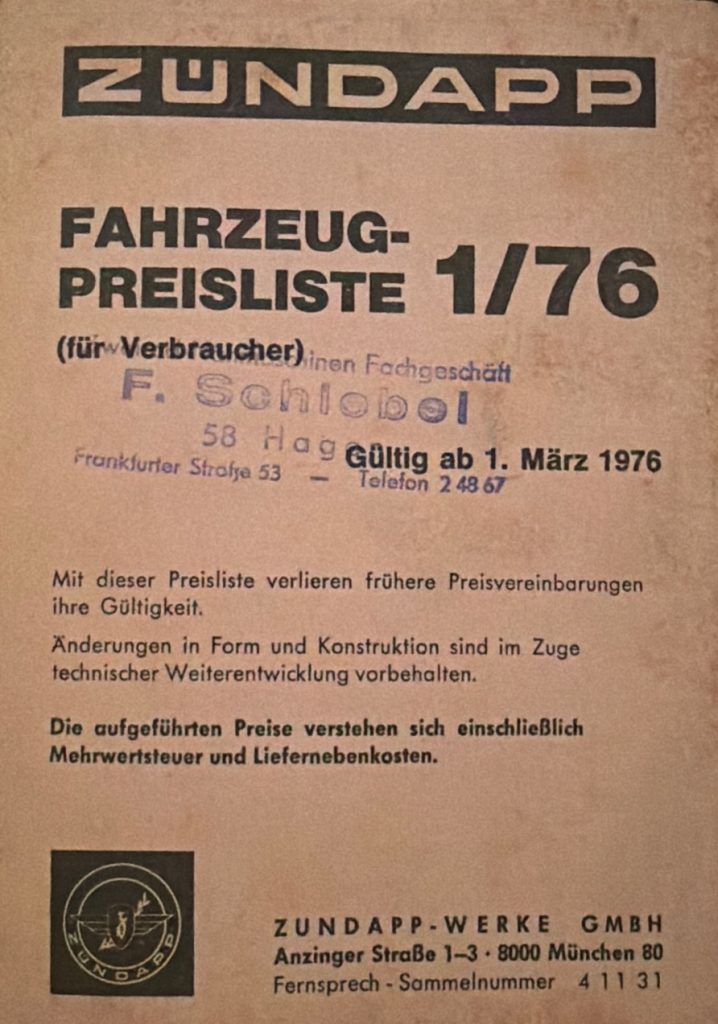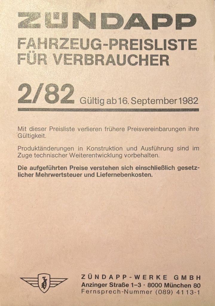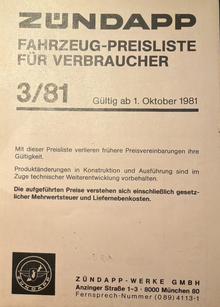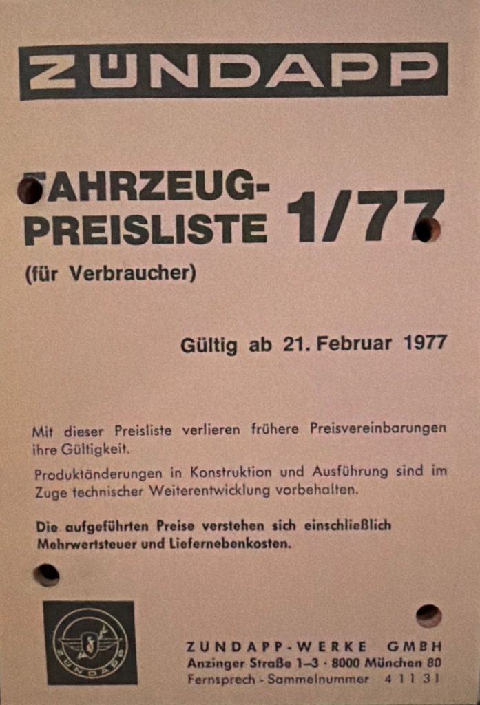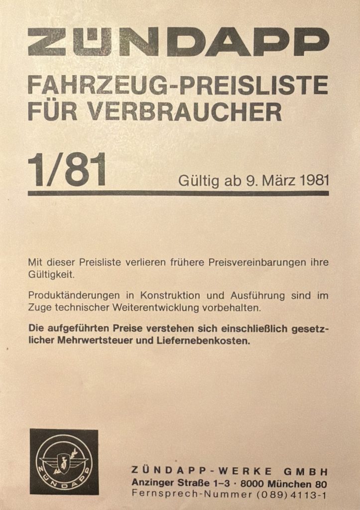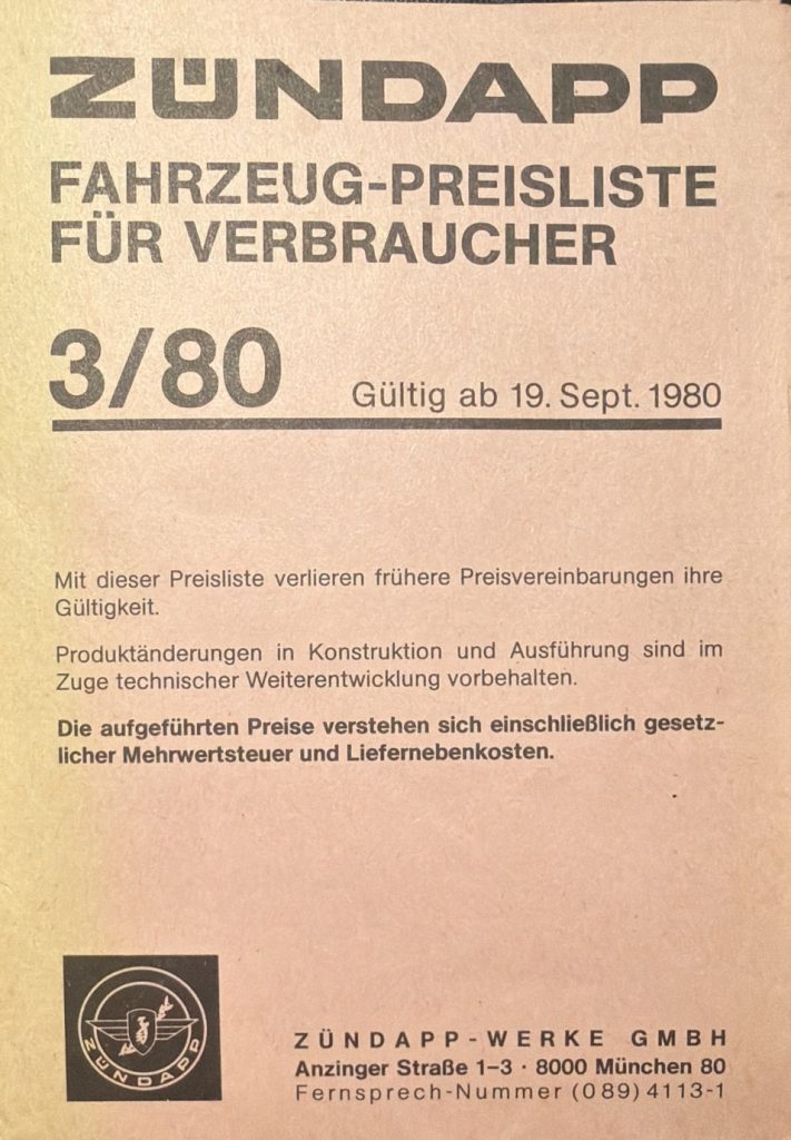 ZÜNDAPP – Preislisten Hier sind ein paar Original Preislisten aus meiner Sammlung. 1976 PREISLISTE 1/76 – HIER KLICKEN 1977 PREISLISTE 1/77 – HIER KLICKEN 1978 PREISLISTE 3/78 – HIER KLICKEN 1980 REISLISTE 2/80 – HIER KLICKEN PREISLISTE 3/80 – HIER KLICKEN 1981 PREISLISTE 1/81 – HIER KLICKEN PREISLISTE 3/81 – HIER KLICKEN 1982 PREISLISTE 1/82 – HIER KLICKEN PREISLISTE 2/82 – HIER KLICKEN 1984 PREISLISTE 1/84 – HIER KLICKEN PREISLISTE 2/84 – HIER KLICKEN FAHRZEUG-PREISLISTE FÜR HÄNDLER 1984 HÄNDLER PREISLISTE 2/84 – HIER KLICKEN